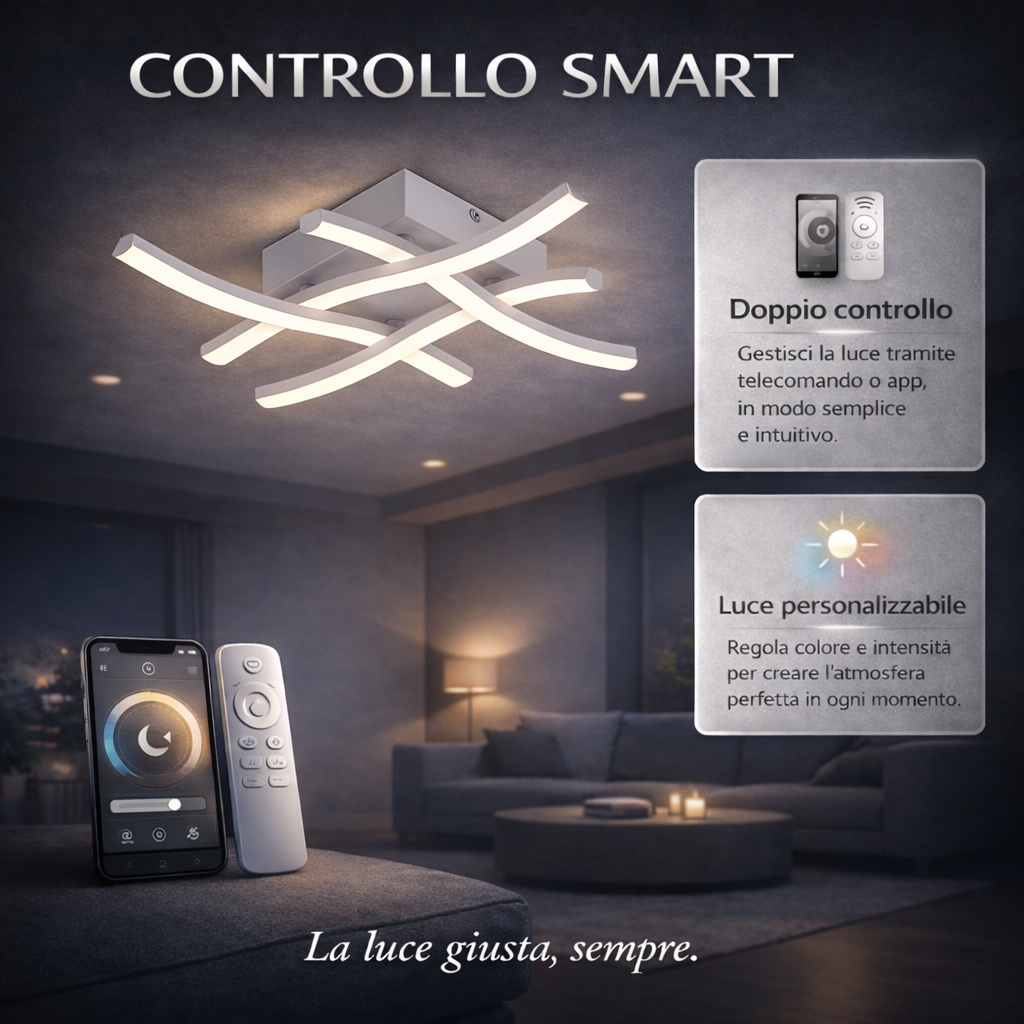 Astra si distingue per le sue barre luminose sinuose che si incrociano con equilibrio perfetto, creando una composizione moderna e armoniosa. Le linee curve donano movimento e leggerezza visiva, rendendolo ideale per soggiorni minimal, camere moderne o ambienti open space dal gusto contemporaneo.